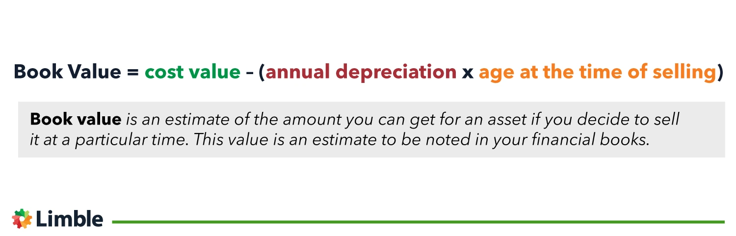 - Book Value: Book value is given by the difference between the cost value of the item and the amount of annual depreciation multiplied by the age of the asset.
