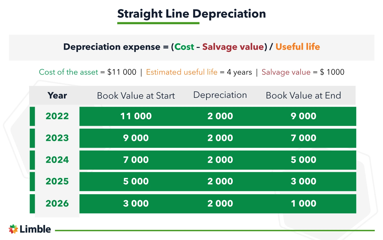 For example, let’s say you buy a piece of equipment for $11 000 which has a useful life of 4 years. If its salvage value is $1000, the depreciation expense will be $2000 per year (based on the formula shown above).