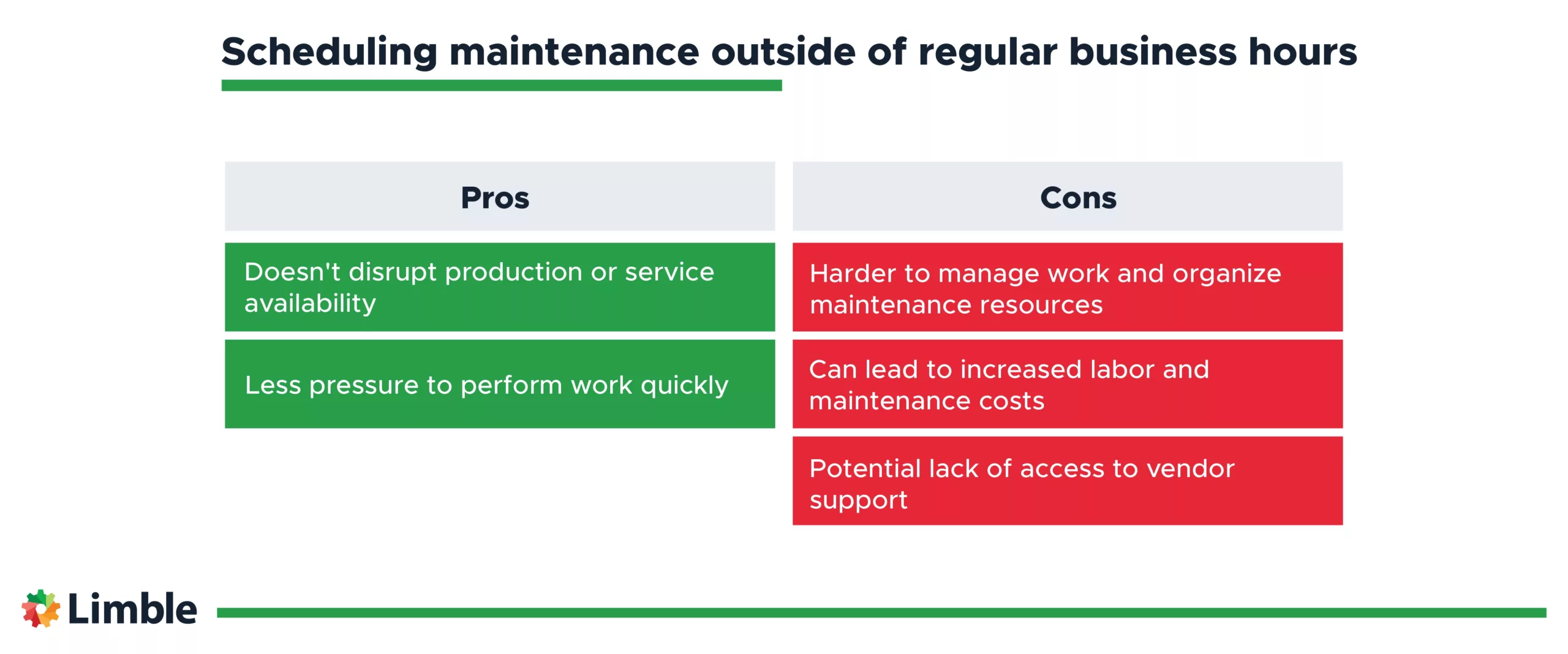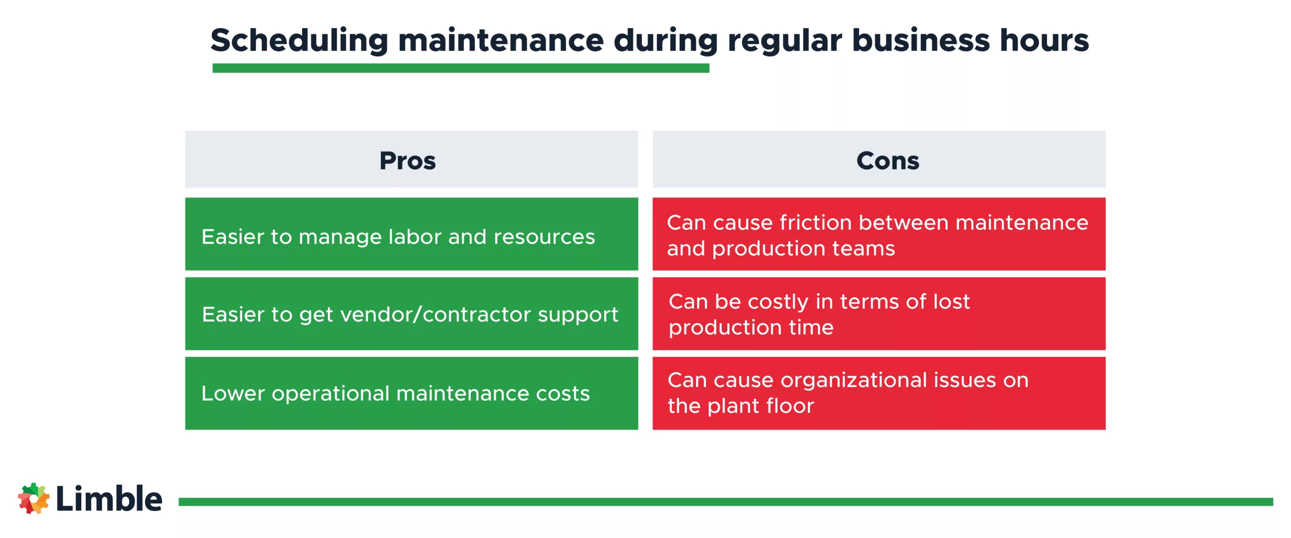 On the plus side, you will typically have more resources at your disposal. Your team should be fully staffed during this time. Furthermore, vendor and contractor help is much easier to obtain during the day. This is critical if you require specialized assistance during your maintenance window.